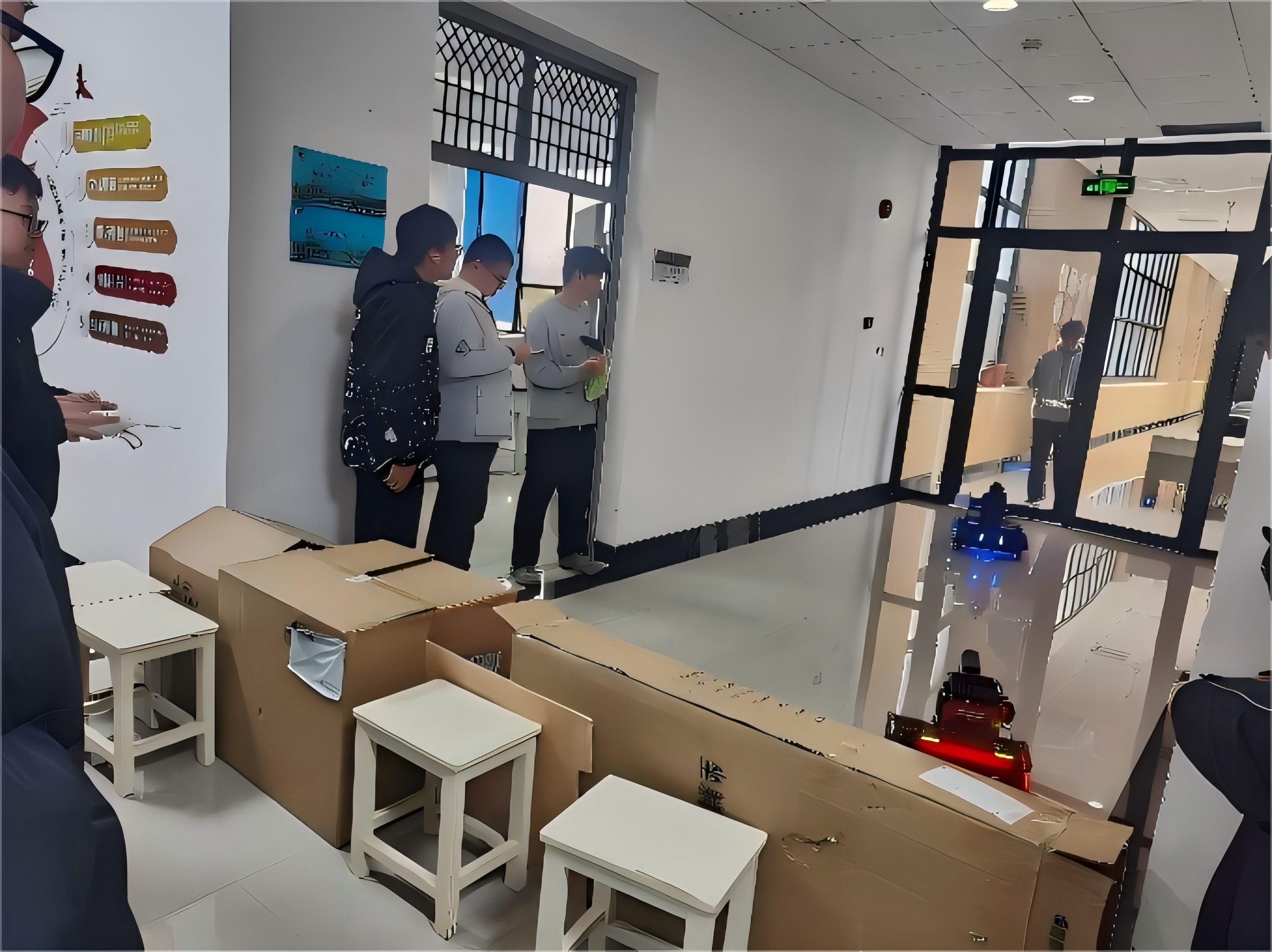 活动尾声,两校队员在实验室门前合影,Robo Vigor战队将印有他们的战队吉祥物小企鹅的亚克力胸针赠与创新社社员。