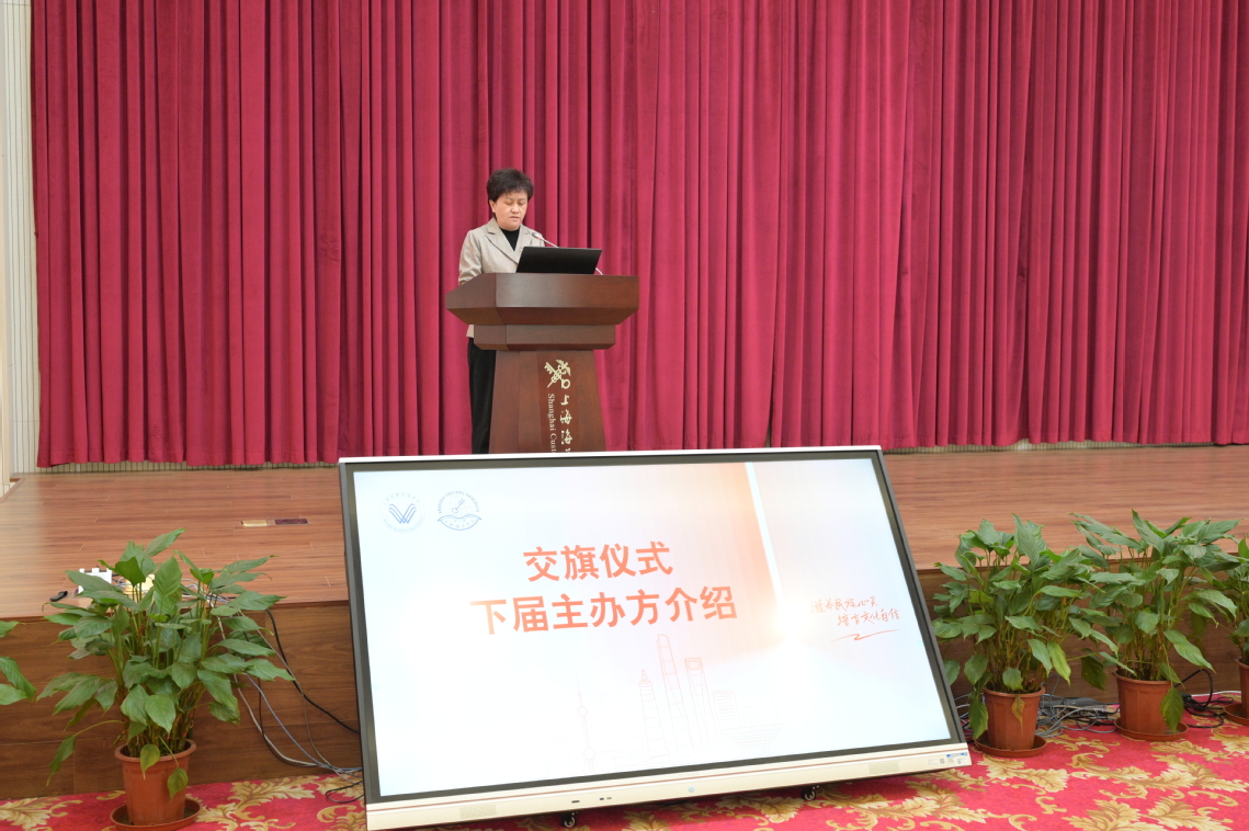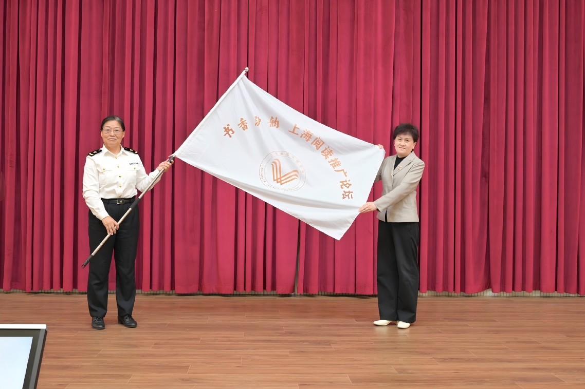 在交旗仪式上,上海电机学院图书馆馆长张慧文代表上海电机学院接旗承办“书香沪韵”2026上海阅读推广论坛。