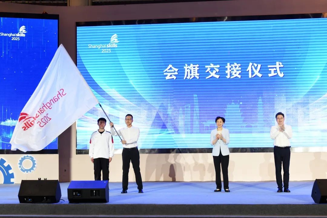 在上海市人社局的见证下,青浦区与闵行区完成了会旗交接,标志着闵行区正式接过接力棒,开启了承办2027年第三届上海市职业技能大赛的新篇章。盛崇建同学以护旗手的身份亲历了这一荣耀时刻。他感慨地说,自己能够取得这样的成绩,离不开上海电机学院与上海电机学院附属科技学校联合开展的中高职贯通人才培养模式。自中职阶段起,他便接受系统化、阶梯式的专业技能训练;升入高职学院后,贯通式培养模式为他开拓了更广阔的成长空间,使他斩获了全国职业院校技能大赛国赛等多项国家级荣誉;得益于学校免笔试专升本选拔机制,他顺利升入机械学院开始本科学习并成功转轨至水处理技术这一“新兴赛道”,在世界技能大赛上海市选拔赛中勇夺金牌。