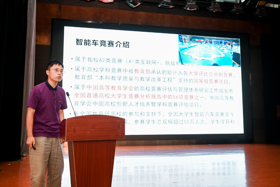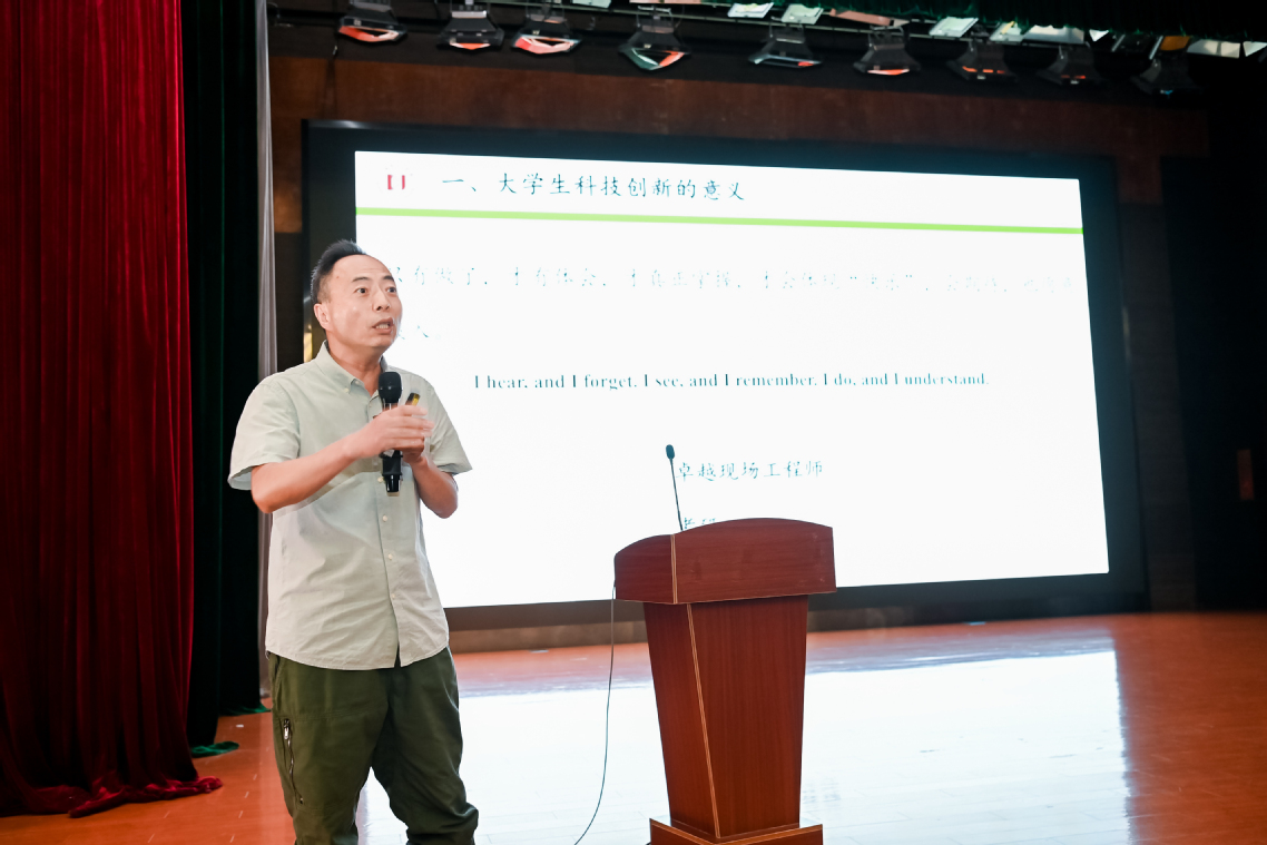 负责学生科创管理工作的石天佑老师首先系统介绍了学院学生科创项目的最新进展,在过去的一年中,机械学子在多个领域深入探索,取得了多项国家级科创奖项,彰显出机械学子敢于怀揣梦想、勇于投身实践的精神风貌。