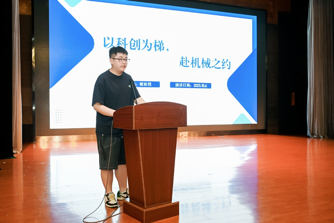 研究生刘宇杰结合自身科创经历,为同学们介绍了自己的科创方法——“三步走”,坚持原则和习惯,做到细心、踏实。本科生代表谢宸恺介绍了自己的科创经验,从学长带自己做项目到自己成立项目组来负责整个小组工作的统筹与推进,在“协作”中实现从“设计”到“落地”的跨越。