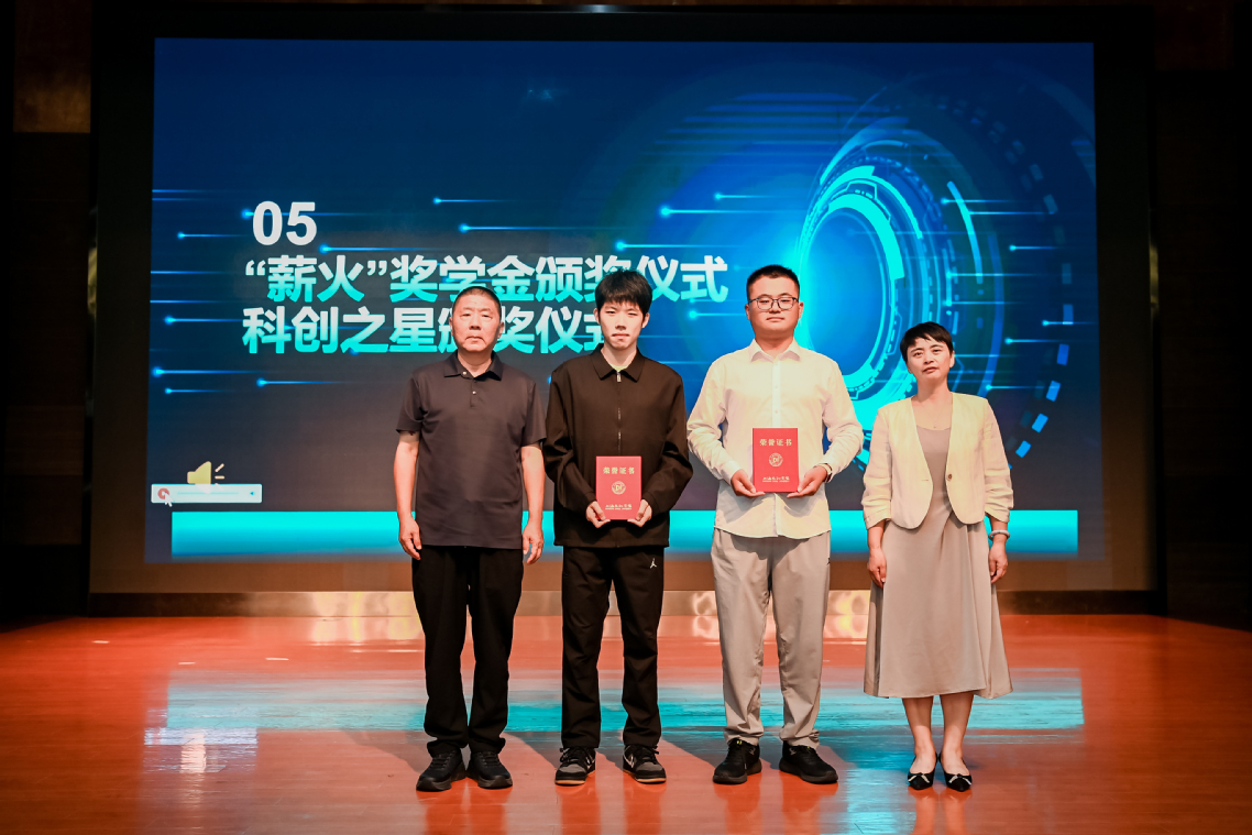 校友互动环节中,BJ0907班校友倪嘉琦、谢海川校友为获得薪火奖学金的同学颁发荣誉证书。模具851班校友张永弟和机制9403班校友干雪红为获得科创之星称号的同学颁发荣誉证书。