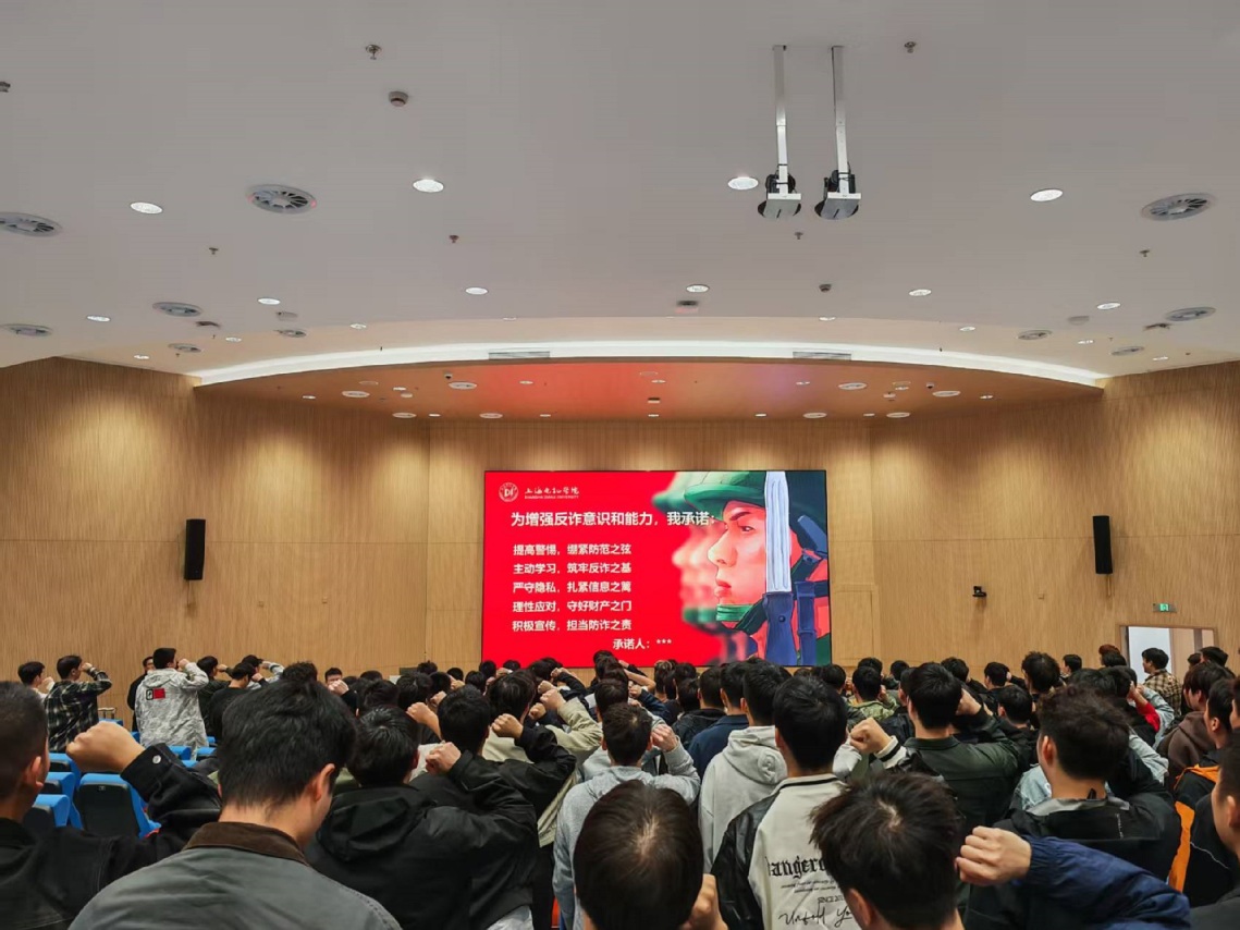 在聆听了张所长精彩的反诈安全报告后,所有退役大学生们在学校强军社同学的带领下通过现场宣誓的形式,向自己郑重承诺,同时也向全校同学发出倡议:人人争当国家安全和反诈防骗的“安全卫士”。