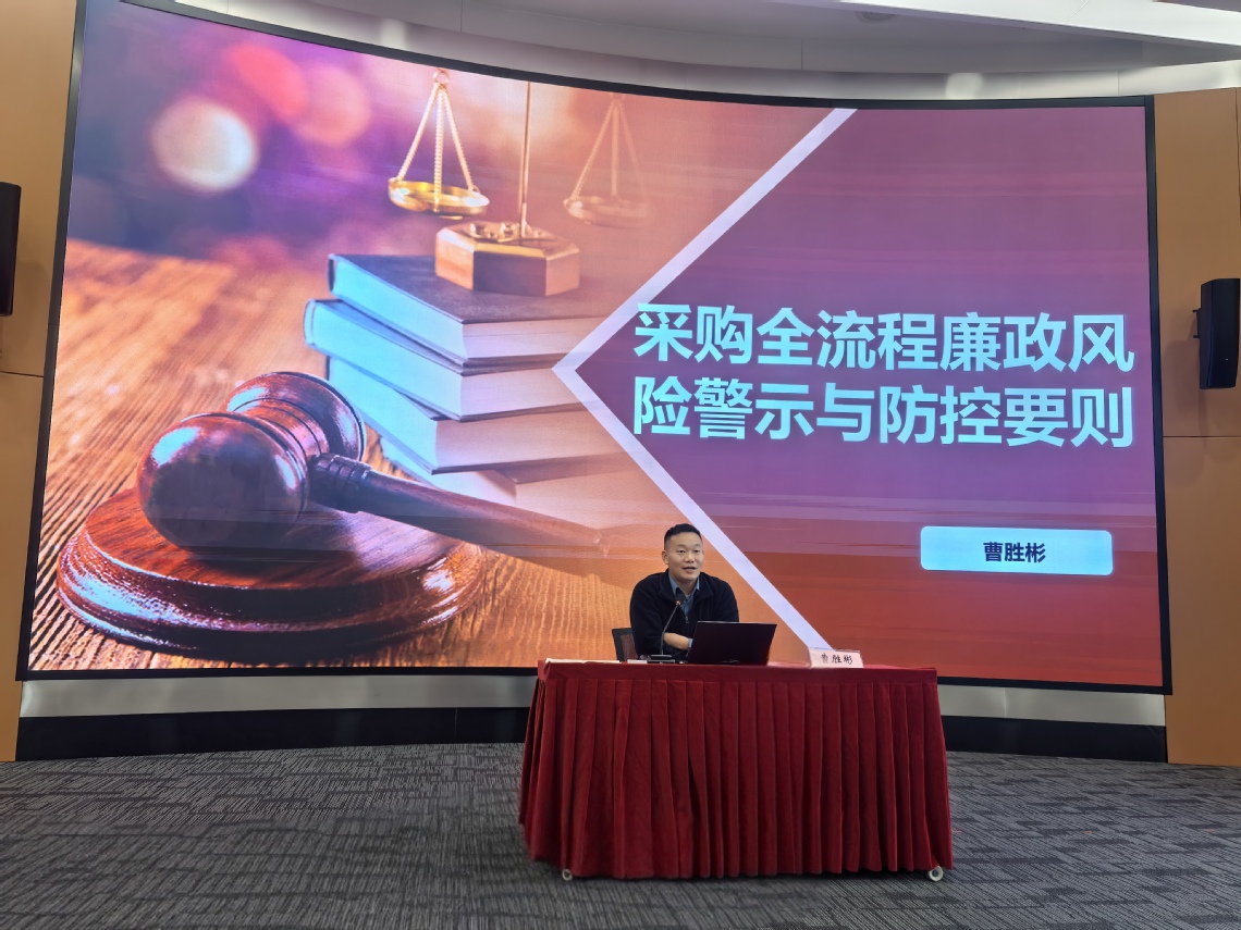 会上,招标办公室主任曹胜彬作了题为“采购全流程廉政风险警示与防控要则”的党风廉政专题宣讲。系统介绍了学校招标采购工作的总体情况,细致梳理了从立项到验收的全流程中可能存在的廉政风险点,并结合典型案例进行了深入剖析与警示。同时,重点阐述了各关键环节的风险防控要则并分享了进一步完善学校招投标工作体系的思考,为全体党员干部上了一堂生动且深刻的廉政风险防控课。