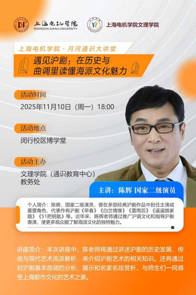本次讲座主讲人将通过讲述沪剧的历史发展、传统与现代艺术流派解析,来介绍沪剧艺术的相关知识。还将通过对沪剧基本曲调的分析、展示和名家名段赏析,与师生们一同感受上海都市文化的艺术之美。