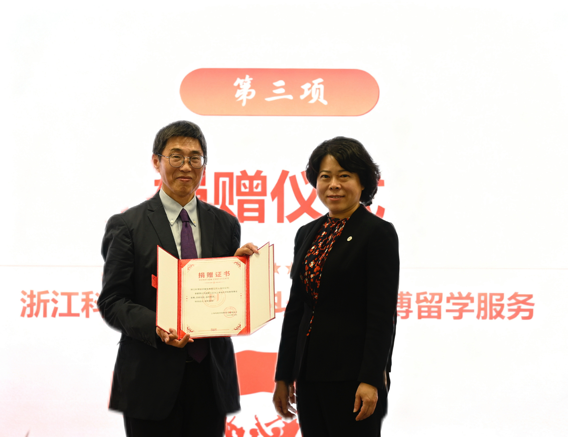 在捐赠环节,由学校党委副书记、副院长李晓军为浙江科博留学服务有限公司上海分公司副总经理薛仁林颁发捐赠证书。此次捐赠是外国语学院坚持党建引领、加强产教融合的成果之一。薛仁林表示,未来科博将进一步加强与学院的合作,在拓宽国际化育人渠道的同时,探索航空航天领域的项目合作,携手共促人才培养,实现校企共同高质量发展。