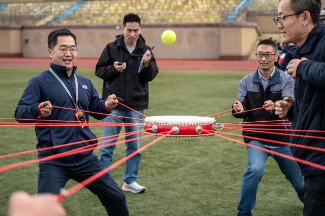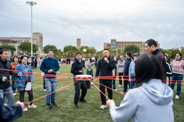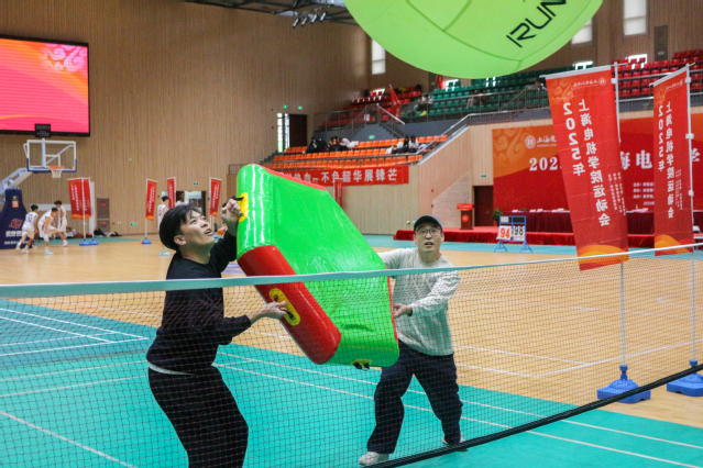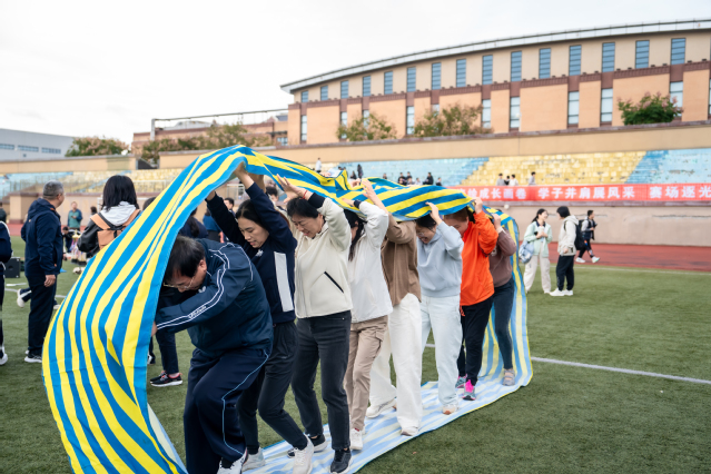 操场上,教工运动会也同步举行,巨人排球、动感颠球、无敌风火轮等趣味比赛轮番竞技,参赛教职工团结协作、奋勇争先,与田径场上的比赛交相呼应,形成校园里一道独特靓丽的风景线。