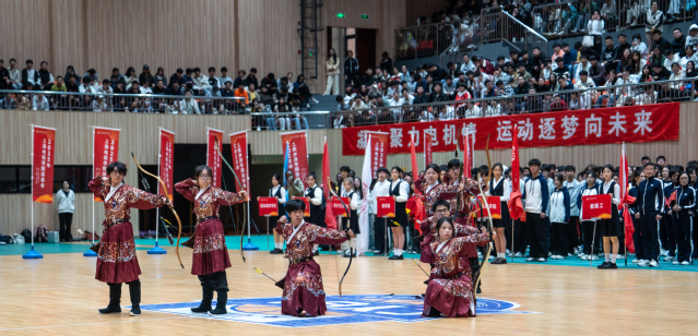 精彩绝伦的文体表演在开幕式上轮番上演。花样跳绳队表演的节目《绳舞飞扬》活力四射,灵动跃动的身姿、默契十足的配合,赢得现场观众阵阵掌声;艺术体操队带来的《灯火里的中国》,将力量与技巧完美融合,展现了青春与美的碰撞;舞狮、射艺、健身健美、拉丁舞、跆拳道等运动队联袂呈现表演《“五”艺全开》更是精彩纷呈、目不暇接,充分展现了学校体育文化的多元魅力,赢得观众阵阵喝彩。