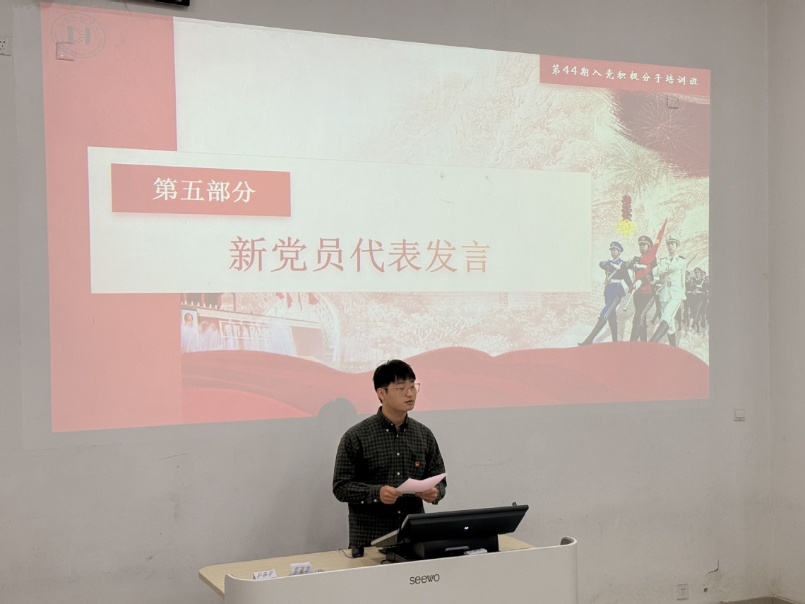 新党员代表分享环节中,研究生党员潘德伟结合科研与学术经历,讲述了自己在专业领域践行“科研报国”初心的历程。他谈到,在党组织培养下,自己始终以“严谨求实、攻坚克难”的态度深耕课题研究,将个人学术追求融入国家工业发展需求,鼓励学员们既要筑牢理论根基,也要练就过硬专业本领,在科研实践中诠释对党的忠诚。