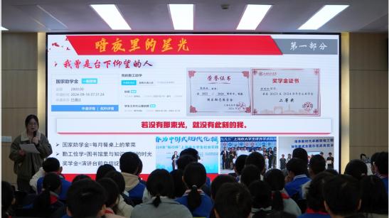 怀揣着对助学金深深的感恩,张雨灿动情地讲述了“她”如何将这份温暖转化为帮助他人的实际行动。紧接着,“时代楷模”黄文秀的故事更将这份无私奉献的精神升华,深深烙印在每位同学心中。