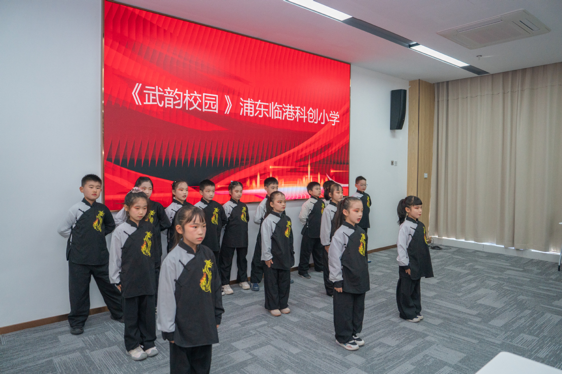 在教学展示环节,浦东临港科创小学的同学们带来传统武术表演《武韵校园》,思政教育扎根小学校园,萌发生机活力,演绎对中华优秀传统文化的传承和发扬。