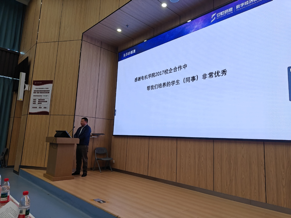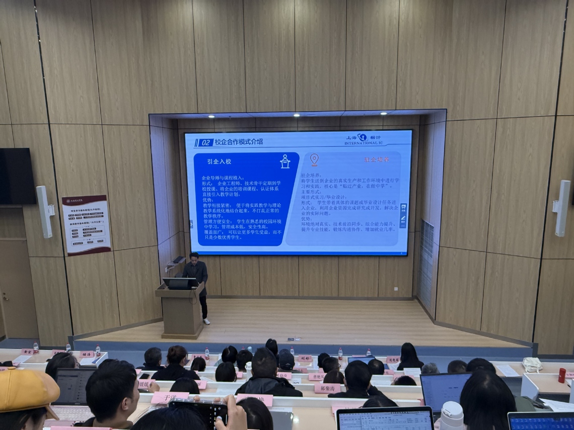 随后,三家企业代表结合自身业务领域与合作实践,分享了产教融合的具体模式与规划,为人才培养注入产业视角。上海帼计集成电路技术有限公司总经理孙鹏程聚焦电子信息工程、通信工程、光电信息科学与工程三个本科专业,详细讲解了“引企入校”合作模式与“驻企实习”实施方案,其打造的芯片测试实训课程体系,涵盖芯片量产测试、可靠性测试等实践内容,已成功指导多名学生完成毕业设计并实现留企就业。杭州安恒信息技术股份有限公司销售总监储浩从全生命周期演训产品体系到多元协同育人模式,从联合实验室建设到教育部协同育人项目落地,展现了网络安全、物联网等领域产教融合的深度与广度,体现了校企共建、资源共享的强大合力。上海临科智华数字科技公司经理黄宜展示了与数据科学与大数据技术、人工智能专业已有的合作成果,并提出未来“驻企实习”设想,该公司自2024年与学院合作以来,已接收电子信息学院多名学生,真正实现“教学-实践-就业”一体化培养。