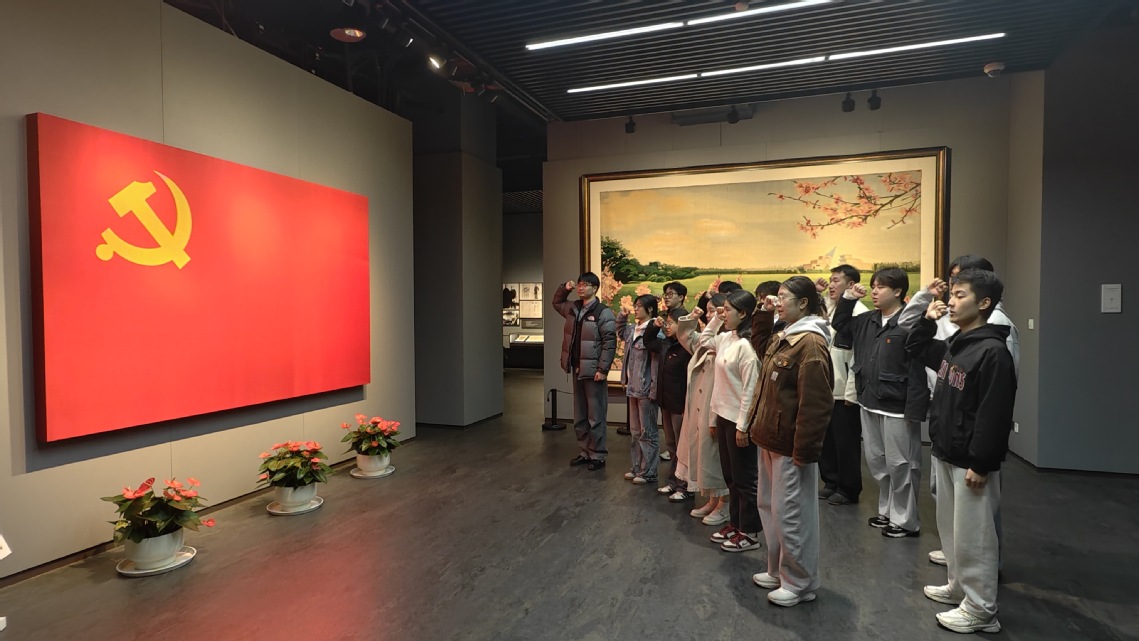 龙华烈士纪念馆中,在讲解员的带领下,大家依次走过各个主题展区,从“信仰的召唤”到“时代的先锋”,一段段历史脉络清晰展开,通过生动的讲述,师生们仿佛回到了那个战火纷飞的年代。在展柜前,同学们久久驻足,感受革命年代的脉搏跳动;在二十四烈士雕塑多媒体剧场中观看震撼演出,其以雕塑、光影等五维艺术,借舞者肢体、悲壮音乐与铿锵朗诵再现烈士精神;在党旗前,党员同志们共同重温入党誓词,以铮铮誓言告慰英烈、鞭策自我。这些跨越时空的对话,不仅是历史的见证,更是信仰的载体,让同学们深切感受到何谓“丹心碧血”,何谓“理想高于天”。