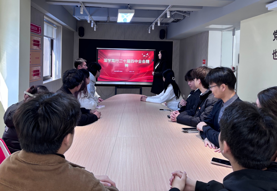 纪念馆参观学习结束后,党支部书记张茜老师以“深学笃行二十届四中全会精神”为主题,为全体党员同学们开展专题讲解。从全会处于“十四五”攻坚与“十五五”谋篇的关键坐标切入,细致解读“制度现代化”的核心要义,还以党建引领基层治理的“四级组织体系”为实例,让理论更易理解。党员们认真聆听,逐步将全会精神与自身成长、服务制造业发展的目标紧密结合。