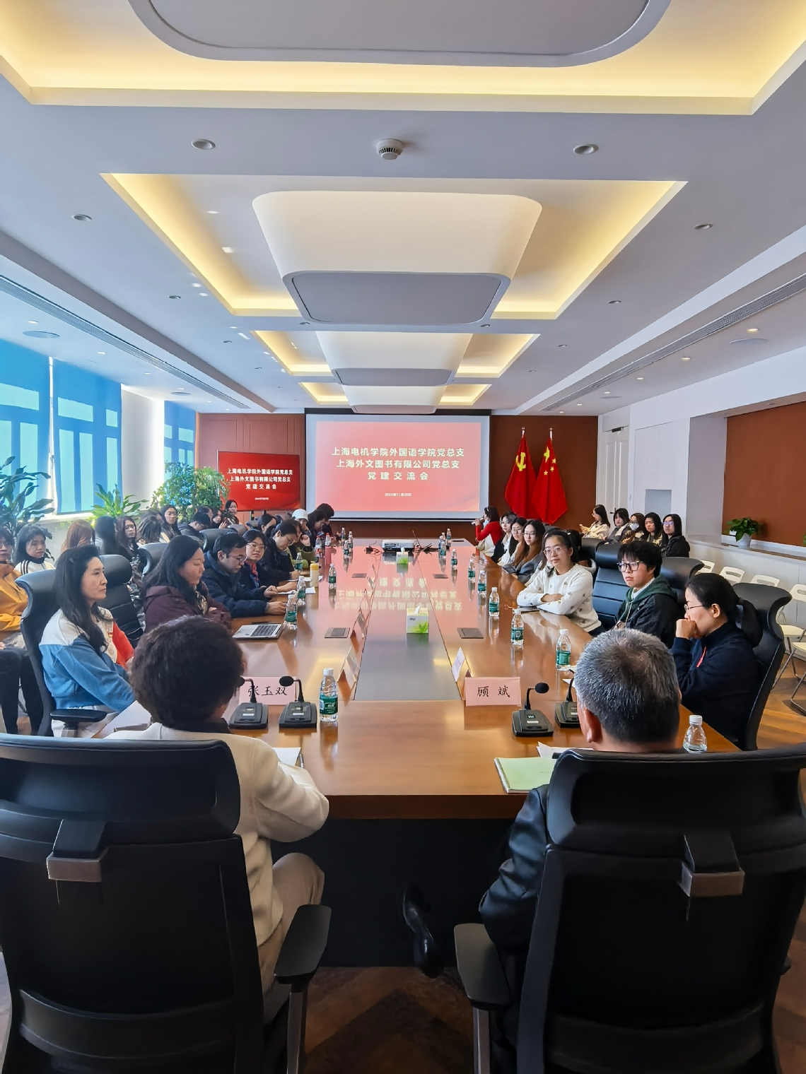 主题党日首站设于上海外文书店。该店前身为成立于1950年4月的国际书店上海分店,1958年8月改为现名,目前常备英、日、法、德等35个语种的外文图书5至6万种。上海外文图书有限公司党总支书记顾斌、党支部书记陈瑞霞,上海电机学院外国语学院党总支书记、院长张玉双,外国语学院党总支委员、支部书记、师生党员代表及入党积极分子共同参加活动。活动由上海外文图书有限公司党支部书记陈瑞霞主持。在交流环节,张玉双介绍了学院党建工作的基本情况。她指出,外语人才应主动肩负新时代使命,“以党建引领书香韵,以爱国心建设人民城”,并对未来双方合作提出展望。顾斌则分享了外文书店党建工作的经验,强调通过“组织联动、资源联享、服务联心”,实现以语言沟通世界、以书香传递情怀、以党建服务人民的目标。