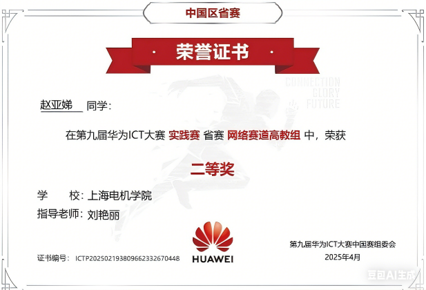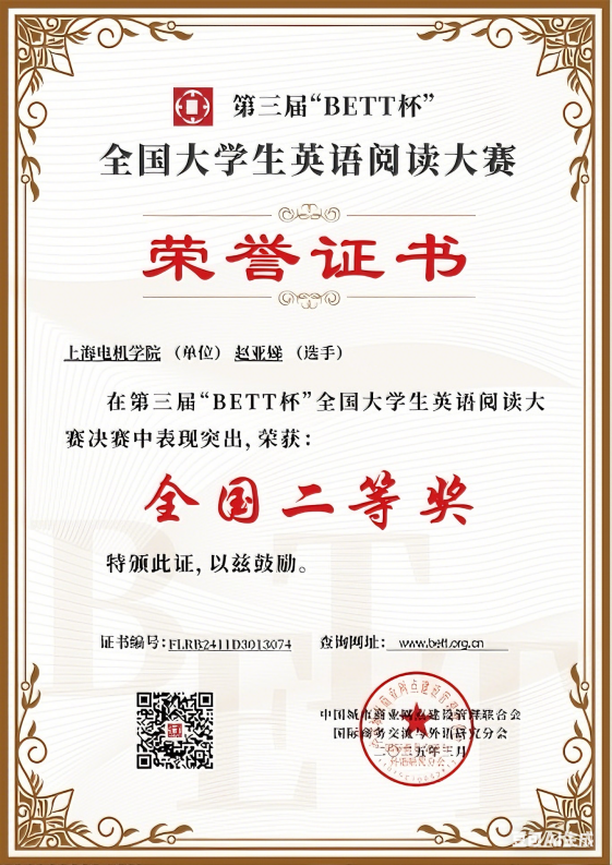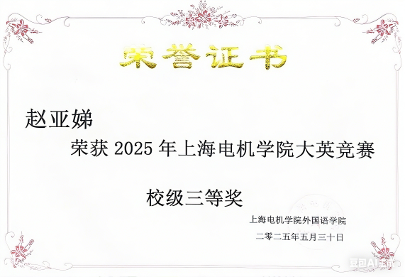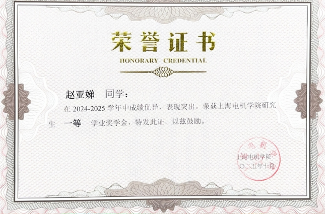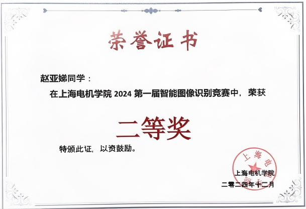 赵亚娣:荣获华为 ICT 大赛上海赛区二等奖、第二十届中国研究生电子设计竞赛上海分赛区团队二等奖、“中国电机工程学会杯”电工数学建模竞赛全国三等奖、全国大学生英语阅读大赛全国二等奖、上海电机学院大英竞赛校级三等奖;