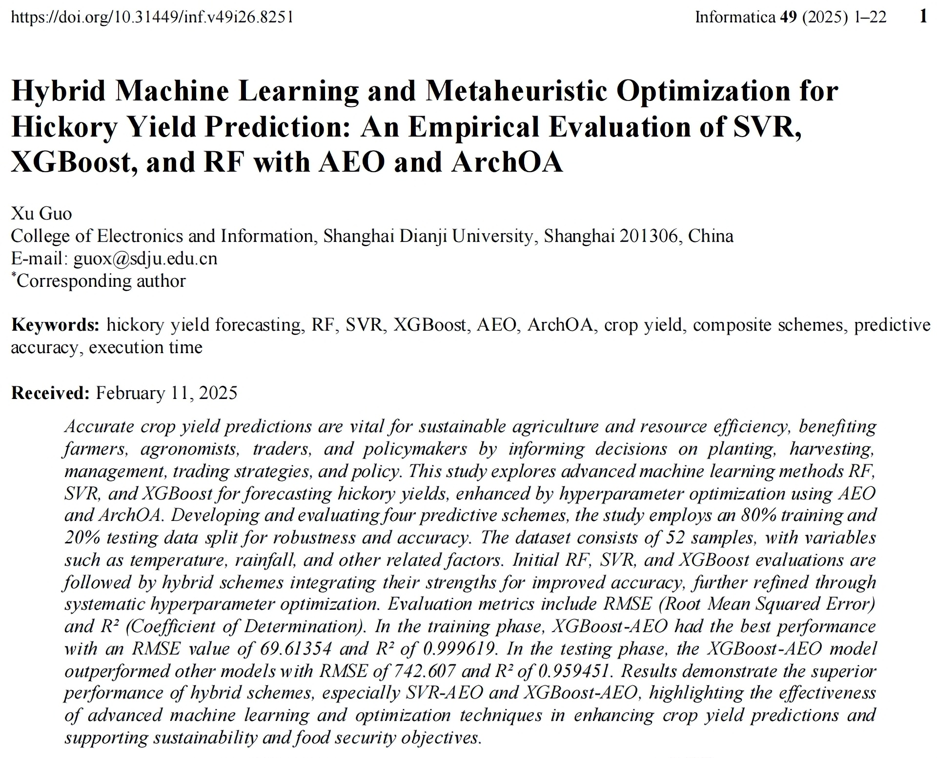 团队青年教师郭煦博士以第一作者在EI期刊Informatica (Informatica 49,2025.1–22)发表论文Hybrid Machine Learning and Metaheuristic Optimization for Hickory Yield Prediction: An Empirical Evaluation of SVR, XGBoost, and RF with AEO and ArchOA (https://doi.org/10.31449/inf.v 49i26.825)。研究探索了用于预测山核桃产量的先进机器学习方法RF、SVR和XGBoost,并通过使用AEO和ArchOA的超参数优化进行了增强。该研究开发和评估了四种预测方案,采用了80%的训练和20%的测试数据分割,以提高鲁棒性和准确性。