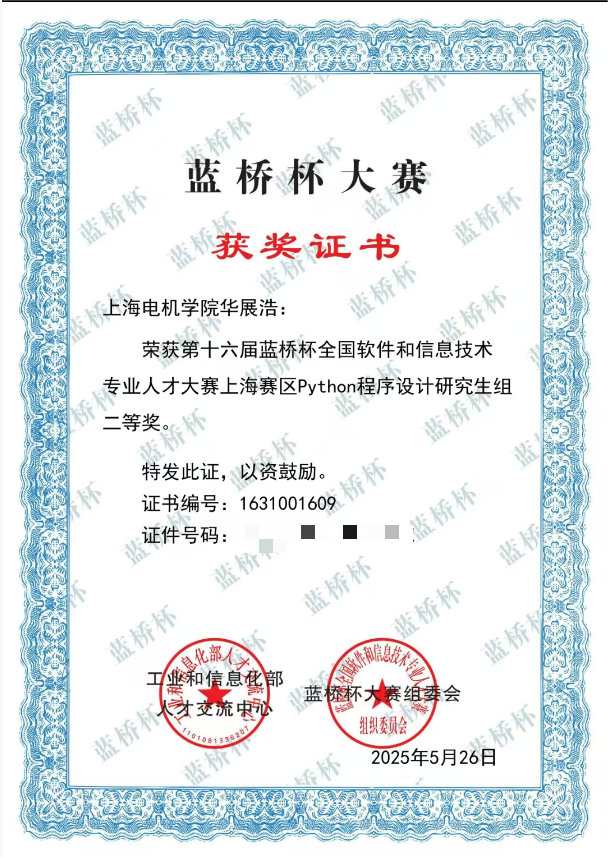 华展浩:荣获第十六届蓝桥杯全国软件大赛上海赛区Python程序设计研究生组二等奖;