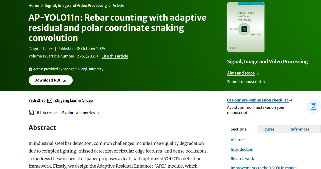 团队研究生赵亚娣同学以第一作者在国际期刊Signal, Image and Video Processing (Springer出版,2025年第19卷,属于中科院4区)发表AP-YOLO11n: Rebar counting with adaptive residual and polar coordinate snaking convolution学术论文。针对工业钢筋计数中光照复杂导致图像失真、圆形边缘漏检、密集遮挡的难题,通过自适应残差路径增强(ARE)模块 + 极坐标蛇形卷积优化YOLO11n框架,解决复杂场景下钢筋的高精度检测与计数问题。