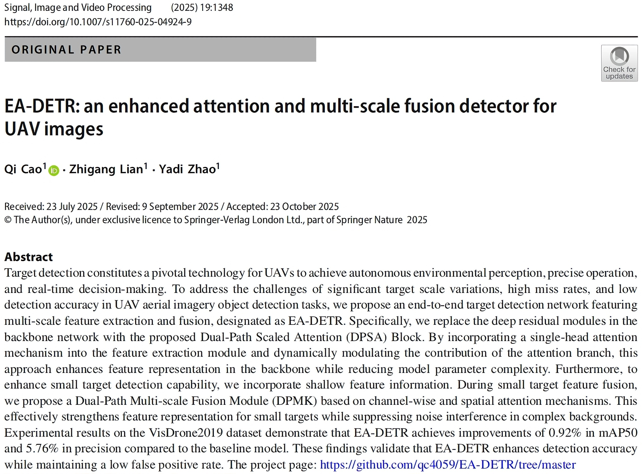 团队研究生曹淇同学以第一作者撰写的EA-DETR: an enhanced attention and multi-scale fusion detector for UAV images学术论文发表于国际期刊Signal,Image and Video Processing (Springer出版,2025年第19卷,属于中科院4区)。聚焦无人机图像目标尺度差异大、小目标漏检、检测精度低的痛点,设计增强注意力机制+多尺度特征融合的EA-DETR端到端模型,提升无人机自主环境感知与精准作业的目标检测性能。