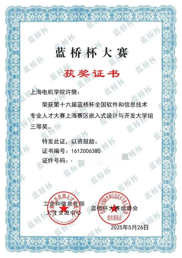 许龑:荣获第十六届蓝桥杯全国软件大赛上海赛区嵌入式设计与开发大学组三等奖;