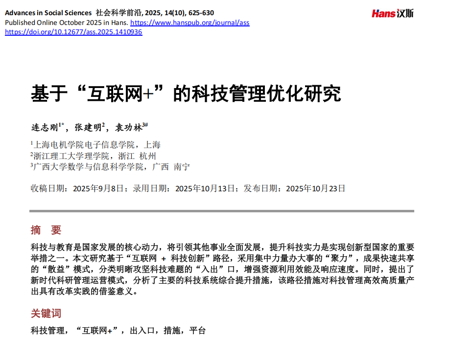 连志刚教授以第一作者身份撰写的《基于“互联网+”的科技管理优化研究》,发表于Advances in Social Sciences《社会科学前沿》2025年第14卷第10期。论文分析了我国科技系统实力与地位不匹配、管理分散、科研异化三大矛盾,创新性提出“聚力攻坚 + 散益共享”双模式及组织架构变革、协同平台搭建等六大优化措施,为科技管理体制改革提供实践思路。
