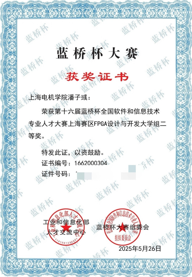 潘子彧:荣获第十六届蓝桥杯全国软件大赛上海赛区FPGA设计与开发大学组二等奖;