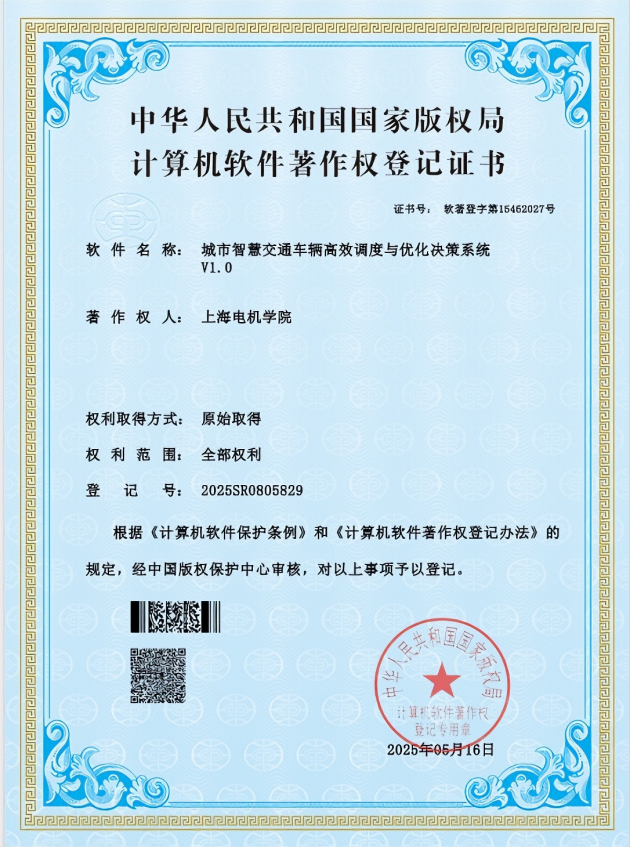 该导学团队以“成果落地”为导向,注重知识产权保护,本年度获批3项计算机软件著作权:包括《无人机物流智能路径规划软件》《城市智慧交通车辆高效调度与优化决策系统》《智能云制造调度管理系统》。
