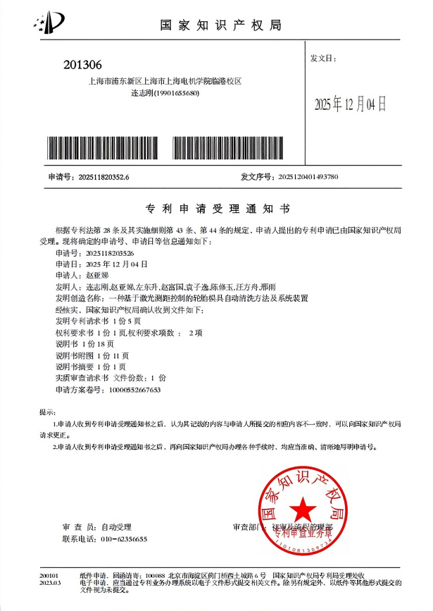 同时申请3项发明专利,其中《一种基于激光测距控制的轮胎模具自动清洗方法及系统装置》成功破解轮胎模具清洗行业长期存在的技术难题。传统清洗方式存在诸多痛点:人工测量模具直径误差大,且定位模具圆心不准,导致机器人机械臂找不到实际圆心,清洗头易偏移;曲型模具参数难以精准测量;高精度夹具、三维扫描等方案成本高、抗粉尘能力弱、算法复杂。