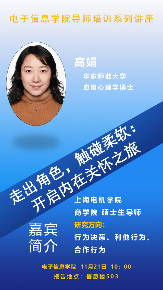 高娟,女,硕士生导师,华东师范大学应用心理学博士。主要研究领域为行为决策、利他行为、合作行为。也擅长心理健康及幸福心理学课程。发表学术论文10篇,其中CSSCI期刊论文3篇,SSCI期刊论文5篇。主持上海市教育科学一般项目1项;参与国家社科重大项目2项、国家社科一般项目1项、国家自然科学基金项目1项、上海教育科学一般项目1项;主持校级德育实践课题1项;主持横向项目1项;获上海电机学院优秀共产党员、三八红旗手等荣誉称号。