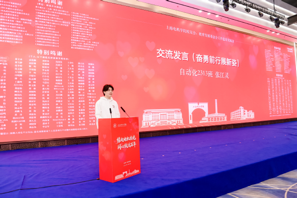 在大会的第二阶段,多位代表上台交流发言。78级自动化专业校友、上海丝凯依纺织品集团有限公司董事长刘金明分享了“少数民族标杆奖学金项目”的育人初心与成效;集成电路行业校友会会长、机制9403班校友干雪红围绕行业聚力促学校发展建言献策;2017届电气工程及其自动化专业校友杨钊分享了扎根西藏基层的奋斗故事;上海市第十一批援疆干部、电气工程BG056校友田程程介绍了对口支援工作的成果与感悟;深圳市国诚投资咨询有限公司上海分公司行政主管韩诗韵代表捐赠单位表达了持续支持学校发展的意愿;受助学生代表自动化2313班张江灵感恩学校与校友、社会各界的关爱,表示将奋勇前行、不负期望。