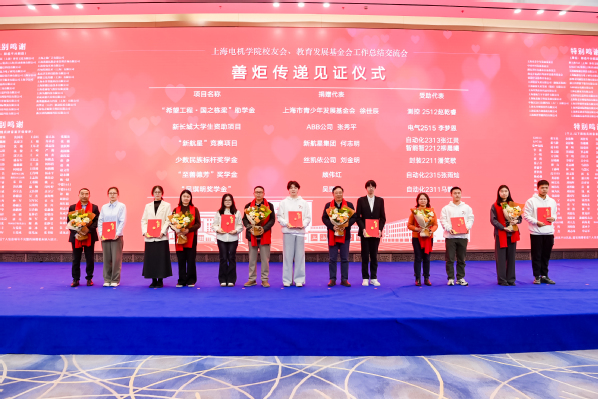 上海新航星投资集团有限公司、上海康桥实业发展(集团)有限公司、上海逸航汽车零部件有限公司、上海永环摩擦材料有限公司等10家单位及个人荣获“卓越领航奖”;上海市青少年发展基金会、上海航菱航空科技发展有限公司、深圳市国诚投资咨询有限公司上海分公司等43家捐赠单位荣获2025年度“同行聚力奖”;电子信息学院、航空学院、材料学院等5个集体及崔艳梅等3名教师荣获2025年度“同心树人奖”。大会还举行了“善炬传递见证仪式”,上海新航星投资集团有限公司等6家捐赠单位与个人代表、受助学生代表上台,共同见证爱心传递的温暖时刻。