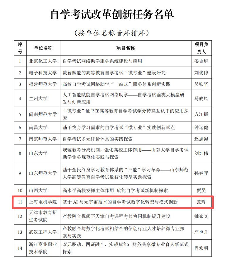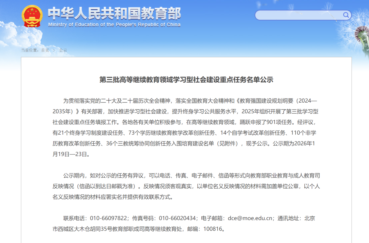为深入贯彻党的二十大及二十届历次全会精神、全国教育大会部署,落实《教育强国建设规划纲要(2024—2035年)》要求,教育部于2025年组织开展此次重点任务申报工作。全国各地各单位积极响应、踊跃参与,共提交申报任务901项,经专家评审委员会严格遴选、审慎评议,最终确定254项任务入围,其中自学考试改革创新任务14项,我校继续教育学院申报的《基于AI与元宇宙技术的自学考试数字化转型与模式创新》成功入选自学考试改革创新任务,标志着学校在高等继续教育数字化转型与自学考试改革领域的探索实践获得认可,彰显了学校在高等继续教育领域的创新实力与育人担当。
