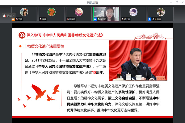 时值《中华人民共和国非物质文化遗产法》通过15周年,支部党员围绕非遗保护法律法规开展专题研学。李浩然同志以“非遗1234式”系统梳理了非遗概念、两部法律文件、三项工作内容及四级名录体系,重点解读了“保护与保存相结合”“传承与传播并重”“区域性整体保护”三大核心理念。她号召党员应带头深学《非遗法》,恪守法律规定,走好“深耕学习、示范引领、创新传播”三条实践路径,以指尖塑红心、非遗助党魂的实际行动,讲好中华优秀传统文化故事。
