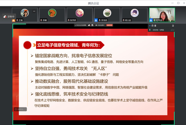 当前正值贯彻落实党的二十届四中全会精神、实现“十五五”良好开局的关键时期。杜雨涵同志结合电子信息专业背景,号召支部党员锚定国家战略方向,聚焦集成电路、人工智能、6G通信、量子信息、网络安全等重点领域,坚持自立自强,勇闯技术攻关“无人区”,以实干实效坚定拥护“两个确立”、坚决做到“两个维护”。