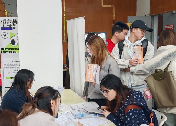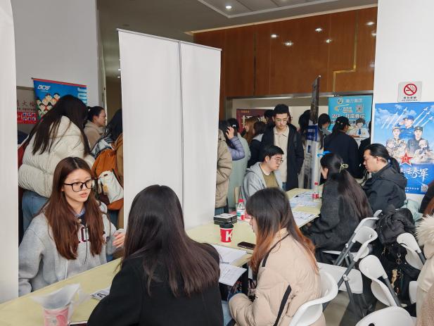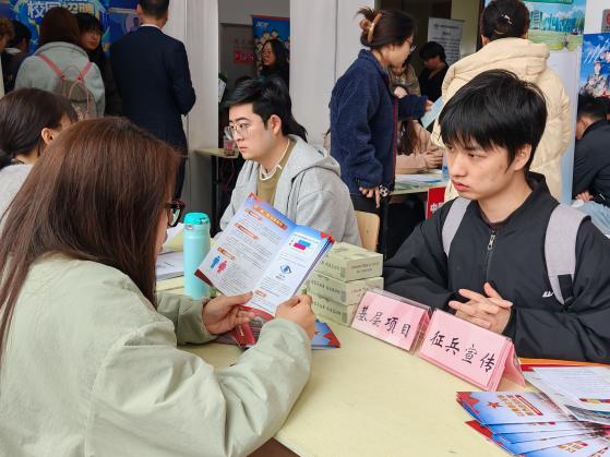 招聘会现场气氛热烈,秩序井然。参会企业涵盖银行、证券、国际贸易、物流、市场营销、教育、翻译等多个领域,与商学院和外国语学院的学科专业高度契合。现场还增设了基层就业和征兵宣讲服务台,为广大学生讲解征兵政策和基层就业政策。各招聘展位前,毕业生们手持精心准备的简历,积极与招聘人员沟通交流,详细了解岗位要求、职业发展及薪资待遇等信息。不少低年级学生也到场观摩,提前感知就业市场动态,为大四实习和未来职业生涯规划积累经验。