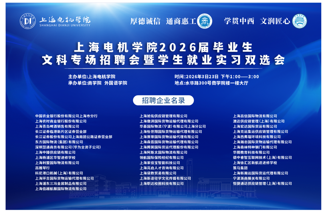 近日,由上海电机学院主办,商学院与外国语学院承办的2026届毕业生文科专场招聘会暨学生就业实习双选会在临港校区商学院一楼大厅顺利举行。本次招聘会聚焦文科类专业学生就业需求,共吸引43家优质用人单位参会,提供就业岗位超100个,为毕业生与用人单位搭建了高效、精准的就业对接平台。