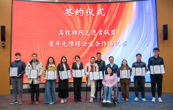 会后,残健融合轮椅跑活动发起人金晶、七所联盟成员校代表、45°青年社团代表共同签署了《高校助残志愿者联盟——青年无障碍公益合作倡议书》。倡议书从凝聚共识、发挥特色、科技向善、价值引领、榜样赋能、能力筑基、创新探索七个方面,明确了未来高校与残联系统深化合作的方向与路径。